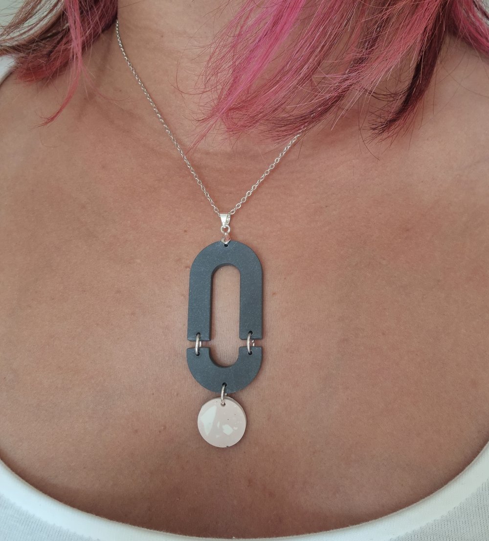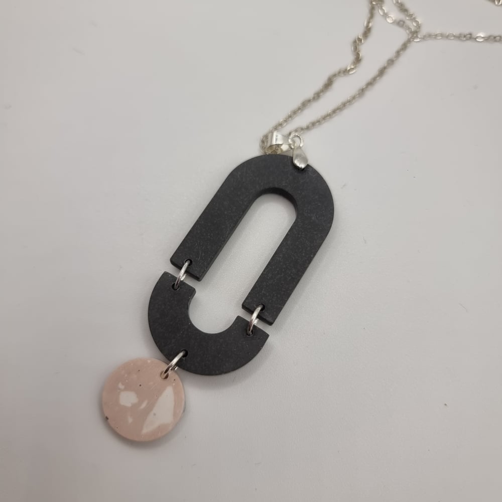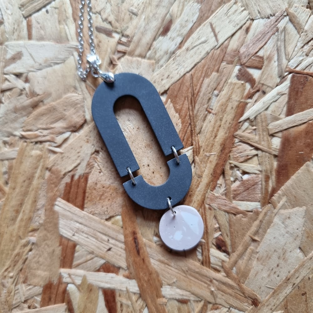 A dark grey and light pink split oval necklace on silver plated trace chain. The pink circle drop is made with added white terrazzo chips.